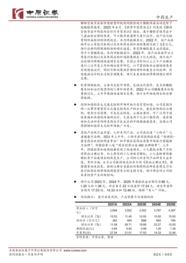 口服药板块看,按照销售额从高到低排序,过亿品种分别为培元通脑胶囊,丹鹿通督片以及参芪降糖胶囊。其中,培元通脑胶囊是公司的独家产品,入选《国家医保目录》,主要用于缺血性中风中经络恢复期。主要的功效和作用为扩血管和改善脑部血液供应,改善脑组织缺血缺氧的症状和体征。米内网数据显示,该产品在城市公立等医疗机构2022年的销售额为4.55亿元,预计该产品全年销售稳定增长。丹鹿通督片含有丹参和鹿角胶等,用于腰椎管狭窄症瘀阻督脉型所致的间歇性跛行腰腿疼痛活动受限下肢酸胀疼痛等。2023年4月,《世界中医药杂志》刊发的《腰椎管狭窄症中西医结合诊疗专家共识》指出,属于腰椎管狭窄症中气虚血瘀证型的患者,可口服丹鹿通督片进行治疗。该产品与贴膏剂形成较好的协同效应。米内网数据显示,2022年,该产品在城市公立等医疗机构以及实体药店的终端销售额突破了3.5亿元,预计后续仍将保持较快的增长速度。参芪降糖胶囊主治消渴症,用于Ⅱ型糖尿病。米内网数据显示,2022年,该产品在城市公立等医疗机构以及实体药店的终端销售额在1亿元附近,预计该产品后续仍将保持快速增长态势。目前公司针对以上三个产品都在进行二次开发工作和循证医学研究,以可靠的临床证据协助患者实现慢病治疗,同时不断向慢病管理的预防和康复方向延伸,实现慢病治疗的全过程管理服务,预计未来该板块将保持稳定增长态势。