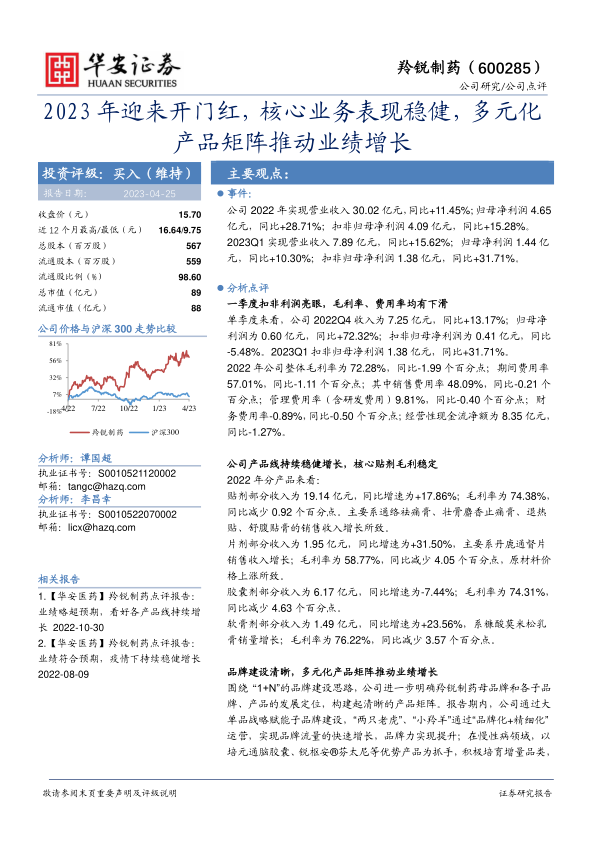 羚锐制药2022年及2023年一季度业绩表现稳健,核心业务贴剂保持增长,多元化产品矩阵初见成效。公司通过清晰的品牌建设和产品定位,在多个细分领域占据领先地位。维持“买入”评级,但需关注政策、产品质量、成本和研发等风险。
