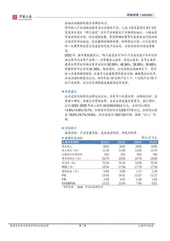 公司是国内贴膏剂品牌龙头企业,具有多个优势品种,品牌效应好,消费者口碑佳。随着公司营销改革,未来业绩发展具有潜力。我们预计,公司2023~2025年收入分别34.5/39.6/45.0亿元,分别同比增长14.8%/14.8%/13.7%,归母净利润分别为5.6/6.7/7.9亿元,分别同比增长19.6%/19.7%/18.6%,对应估值为16X/13X/11X。维持“买入”评级。