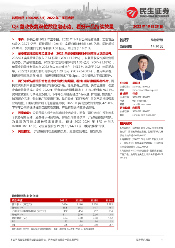 投资建议:公司是国内领先的贴膏剂中药企业,拥有“两只老虎”系列等多个优势贴膏品种,消费者认可度较高。伴随公司营销改革,产品销量逐步增长,为业绩的可持续增长带来确定性。预计2022-2024年EPS分别为0.80/0.98/1.12元,对应当前股价PE为18/14/13倍,维持”推荐”评级。