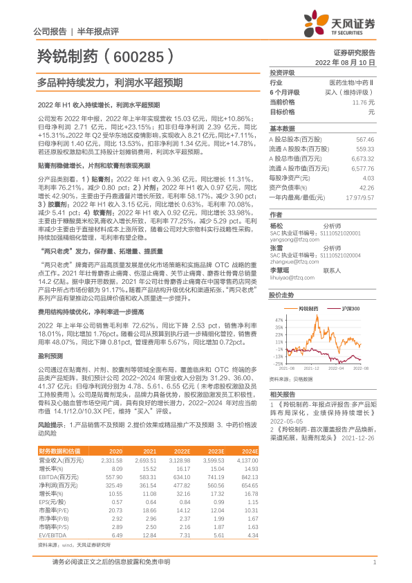 羚锐制药2022年上半年业绩表现亮眼,多品种发力,利润水平超预期。公司在贴膏剂领域保持领先地位,并通过产品结构优化和渠道拓展,不断提升品牌价值和市场份额。费用结构的持续优化也为公司盈利能力的提升奠定了基础。维持“买入”评级,但需关注产品销售、提价效果以及中药价格波动等风险。