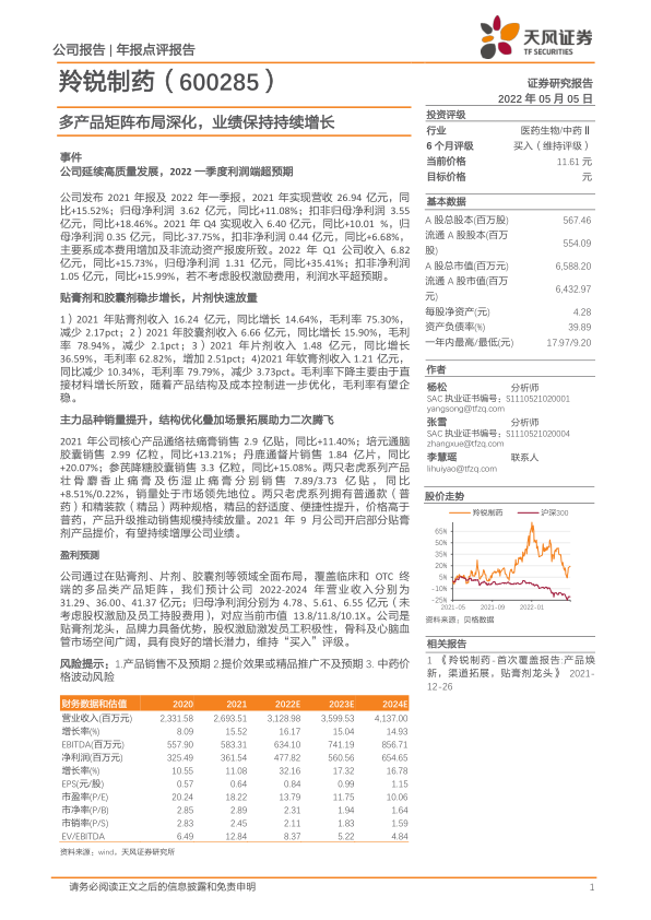 羚锐制药通过多产品矩阵布局和主力品种的销量提升,以及产品结构的优化和场景拓展,实现了业绩的稳健增长。公司2021年业绩符合预期,2022年一季度利润超预期,显示出良好的发展势头和盈利能力。公司在贴膏剂、片剂、胶囊剂等领域全面布局,覆盖临床和OTC终端的多品类产品矩阵,具有良好的增长潜力。维持“买入”评级。