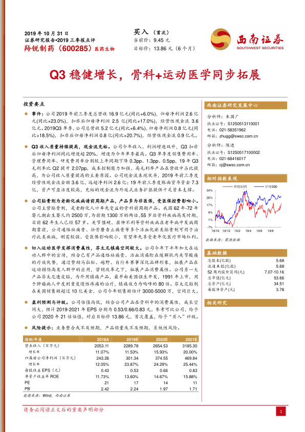 本报告对羚锐制药(600285)的三季报进行了深度分析,并首次覆盖给予“买入”评级,目标价13.86元。