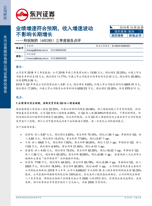 2018年前三季度,羚锐制药实现营业收入15.95亿元,同比增长22.25%;归属于上市公司股东净利润2.13亿元,同比增长11.77%;归属于上市公司股东扣非净利润2.10亿元,同比增长20.58%。每股收益(EPS)为0.36元。 就第三季度单季而言,公司实现营业收入4.91亿元,同比增长4.05%,相较于第二季度30.94%的增速明显放缓。然而,归属于上市公司股东扣非净利润为6292.23万元,同比增长20.20%,利润端增速环比有所提高。收入增速放缓主要系公司对渠道发货进行了控制,预计旨在调整低毛利率产品价格,以进一步优化公司的盈利能力。