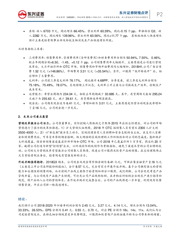 截至2018年第三季度末,公司现金及现金等价物余额为6.41亿元,可供出售金融资产2.16亿元(主要为亚邦股份股权),合计拥有8.57亿元的资金实力,完全有能力开展外延并购。基于公司强大的营销能力和全国性的销售网络,以及目前主要限于贴膏剂和部分口服药的产品线,公司预计将优先考虑产品线丰富、与现有产品能产生协同效应、可补充公司产品线的标的。通过并购后对标的企业的生产进行指导和规范,并将产品纳入公司营销体系,有望进一步丰富产品线,利用现有优势销售资源,开启公司新一轮高速增长。