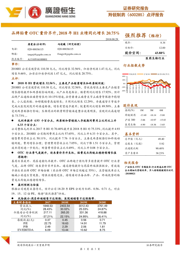 点评报告:品牌贴膏OTC量价齐升,2018年H1业绩同比增长20.75%