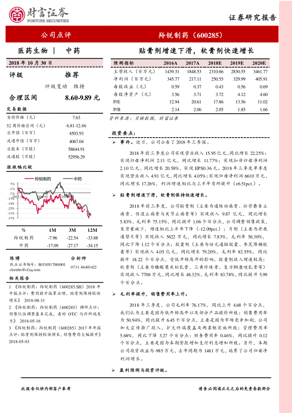中心思想 业绩增长分析: 2018年前三季度,羚锐制药营业收入和归母净利润均实现同比增长,其中三季度单季度利润增速提升。 投资评级维持: 维持“推荐”评级,合理区间为8.60-9.89元,看好公司核心产品及渠道拓展。 主要内容 公司业绩与盈利能力分析 营收与利润增长: 2018年前三季度,公司实现营业收入15.95亿元,同比增长22.25%;归母净利润2.13亿元,同比增长11.77%。 产品收入结构变化: 贴膏剂收入增速放缓,但仍占据主要地位;胶囊剂受益于低开转高开,收入增速显著;软膏剂保持快速增长。 产品销售情况分析 贴膏剂: 2018年前三季度收入9.87亿元,同比增长5.83%,增速较上半年有所下降,毛利率同比提升1.06个百分点。 片剂: 实现收入5622万元,同比增长7.83%,毛利率同比下降1.12个百分点。 胶囊剂: 实现收入4.05亿元,同比增长79.20%,毛利率同比提升18.22个百分点,主要受益于低开转高开。 软膏剂: 实现收入7708万元,同比增长48.32%,毛利率同比提升5.99个百分点。 盈利能力与费用分析 毛利率提升: 2018年三季度毛利率76.17%,同比上升4.68个百分点,主要由于低开转高开及部分产品提价。 销售费用率上升: 销售费用率为50.94%,同比提升6.45个百分点,主要因为市场竞争加剧,公司加大宣传推广投入,扩大终端覆盖及两票制实施。 管理费用率下降: 管理费用率5.68%,同比下降3.27个百分点。 财务费用率上升: 财务费用率0.46%,同比提升0.12个百分点,主要因为本期贷款增加支付利息增加。 投资收益下降: 本期公司投资收益为-985万元,去年同期为1481万元,拖累了公司归母净利润增长。 盈利预测与投资评级 盈利预测: 预计公司2018-2020年实现营业收入23.11/28.31/34.62亿元,归属母公司股东净利润2.51/3.30/4.06亿元,EPS为0.43/0.56/0.69元。 投资评级: 维持“推荐”评级,给予公司2019年20-23倍PE,合理区间为8.60-9.89元。 风险提示 口服药市场拓展不及预期 OTC、诊所渠道拓展不及预期 总结 业绩增长与产品结构: 羚锐制药2018年前三季度营收和利润实现增长,但贴膏剂增速放缓,软膏剂和胶囊剂表现亮眼。 盈利能力与费用控制: 毛利率有所提升,但销售费用率上升明显,对利润增长造成一定压力。 投资建议: 维持“推荐”评级,看好公司未来在OTC和诊所渠道的发展潜力,但需关注口服药市场拓展和渠道拓展的风险。