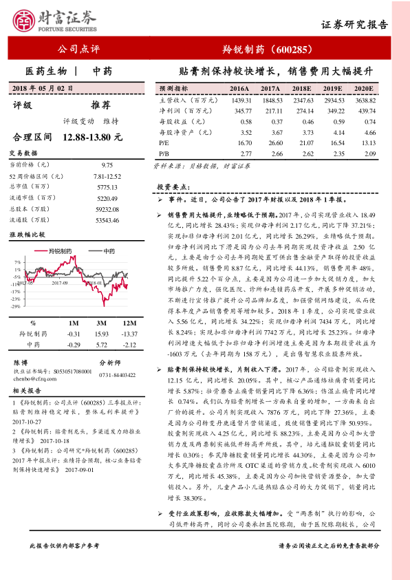 本报告对羚锐制药2017年业绩和2018年一季报进行了分析,指出公司在贴膏剂业务保持增长的同时,面临销售费用大幅提升和应收账款增加的挑战。报告下调了公司盈利预测,并给出了投资建议和风险提示,为投资者提供了参考。