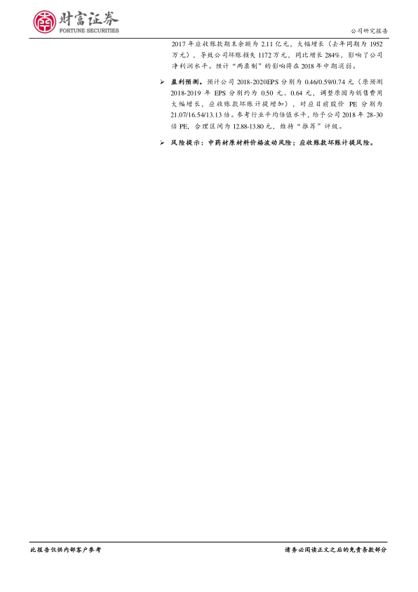 报告肯定了公司贴膏剂业务的增长,但由于销售费用和坏账准备的增加,下调了公司2018-2020年的盈利预测,并给出了相应的投资评级和风险提示。