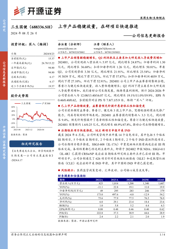 上市产品销售额稳健增长,Q2利润承压主要系加大研发投入导致费用增加2024H1,公司实现收入营业收入5.97亿元,同比增长24.87%;归母净利润1.30亿元,同比增长36.68%;扣非归母净利润1.26亿元,同比增长50.81%。单看Q2,公司实现营收3.30亿元,同比增长21.91%,环比增长23.54%;归母净利润3839万元,同比下滑37.31%,环比下滑57.87%;扣非归母净利润4039万元,同比下滑27.10%,环比下滑52.91%。2024H1公司上市产品益赛普销售额企稳,赛普汀与健尼哌快速放量,收入整体稳健增长;Q2利润下滑主要系加大研发投入导致费用增加。我们看好公司长期发展,维持原盈利预测,预计2024-2026年公司营业收入为12.08/13.40/16.07亿元,同比增长19.1%/11.0%/19.9%,EPS为0.46/0.40/0.62,当前股价对应PS为7.8/7.1/5.9倍,维持“买入”评级。
