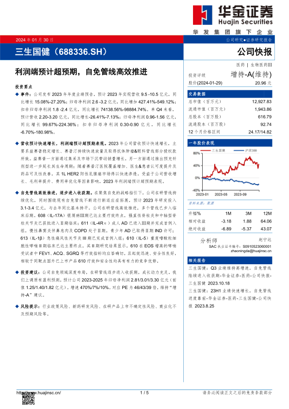 三生国健2023年业绩预告显示,公司营收和利润均实现超预期增长,其中归母净利润同比增幅高达427.41%-549.12%,扣非归母净利润更是实现74138.56%-98884.74%的惊人增长。这主要得益于核心产品益赛普的稳定增长和创新产品赛普汀的快速放量,以及公司在毛利率提升和费用率优化方面的显著成效。同时,公司在自身免疫疾病领域的深度布局和高效研发推进也取得了丰硕成果,多条在研管线已进入临床后期并取得积极进展,如608银屑病III期达主要终点,611成人AD进入III期,610重度嗜酸粒细胞性哮喘II期达主要终点并展现出竞争优势。这些进展预示着公司未来成长动力充足,逐步进入产品收获期。尽管面临行业政策、新药研发和商业化等潜在风险,但公司凭借其稳健的产品组合和强大的研发实力,有望持续保持增长态势,华金证券维持“增持-A”的投资建议,并上调了未来盈利预测。