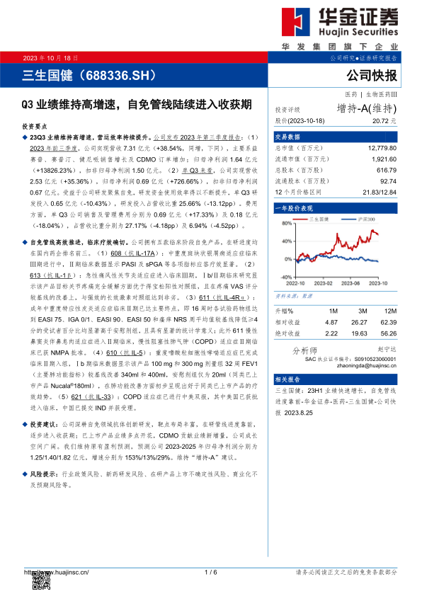 本报告对三生国健2023年第三季度的业绩进行了分析,认为公司业绩维持高增速,营运效率持续提升,自免管线高效推进,临床疗效确切,未来成长空间广阔。维持“增持-A”的投资评级,但同时也提示了行业政策、新药研发、产品上市和商业化等方面的风险。