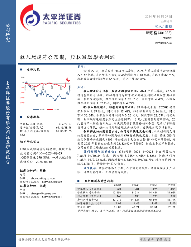 本报告分析了诺思格2024年三季报,指出公司收入增速符合预期,但利润受到股权激励的影响。尽管短期利润承压,但考虑到行业发展机遇和公司在临床CRO领域的潜力,维持“买入”评级。同时,报告也提示了新签订单、人才流失、环保安全、订单价格和汇率波动等风险。