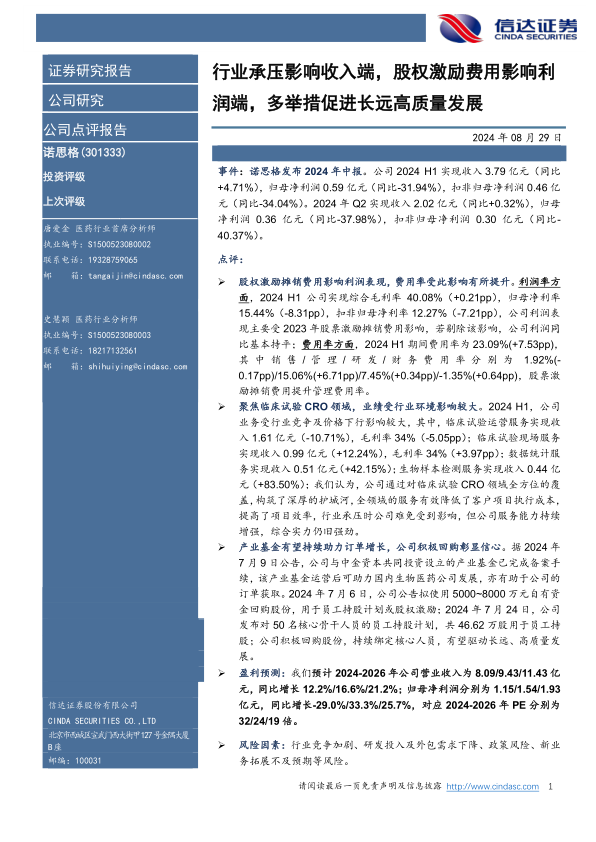 本报告分析了诺思格2024年中报,指出公司上半年收入小幅增长,但归母净利润显著下降。利润下降的主要原因是股权激励摊销费用增加,导致费用率上升。尽管短期业绩承压,但公司在临床试验CRO领域的全方位覆盖构筑了深厚的护城河,长期来看,产业基金的设立和员工持股计划的推出,有望助力公司订单增长和长远发展。