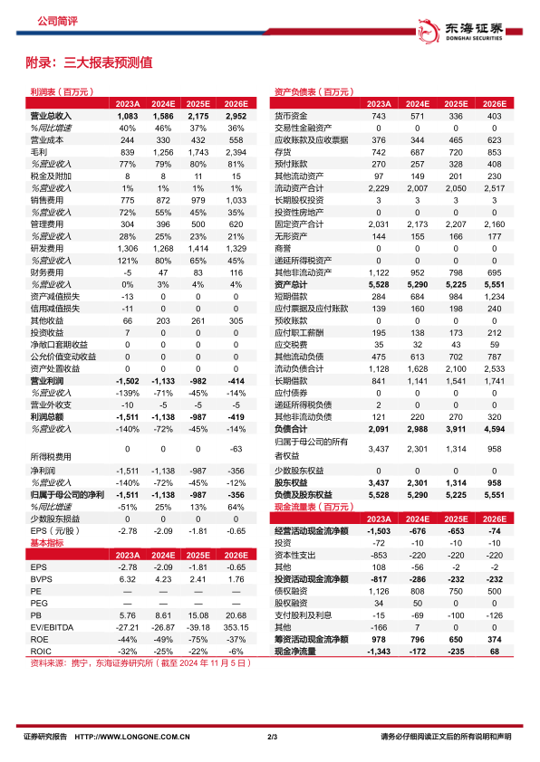预测公司2024-2026年实现营业收入15.86/21.75/29.52亿元,归属于母公司净利润-11.38/-9.87/-3.56亿元,维持“买入”评级。