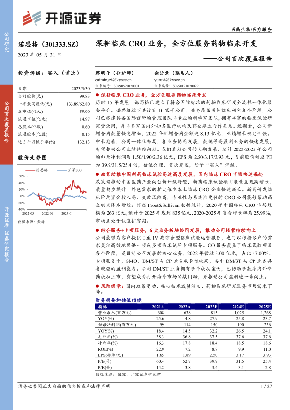 历时 15 年发展,诺思格已建立了符合国际标准的药物临床研发全流程一体化服务平台。 诺思格旗下共设有 10 家子公司,业务覆盖医药临床研究各个阶段, 公司已搭建具备国际视野的管理团队与专业的科学家团队, 拥有丰富的临床试验研究资源网, 并与多家国内外知名医疗机构及药企建立合作关系。 短期看,公司新增合同数量快速增加, 2022 年新增合同金额达 8.13 亿元, 业绩增长确定性强。中长期看,公司一体化布局,各业务协同发展, 数统等高盈利业务的快速发展,有望推动公司业绩持续向好。 我们看好公司的长期发展,预计 2023-2025 年公司的归母净利润为 1.50/1.90/2.36 亿元, EPS 为 2.50/3.17/3.93 元,当前股价对应 PE为 39.9/31.5/25.4 倍,估值合理,首次覆盖,给予“买入”评级。