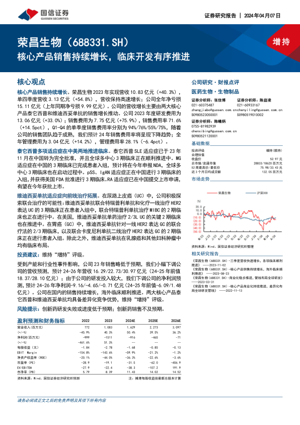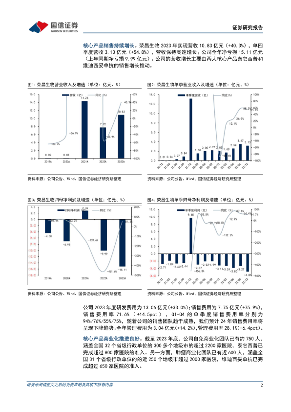 本报告分析了荣昌生物2023年的财务表现和核心产品的临床进展。公司营收增长主要由泰它西普和维迪西妥单抗驱动,但研发投入和销售费用增加导致亏损扩大。泰它西普和维迪西妥单抗的多个适应症临床试验正在推进中,为公司未来增长提供动力。尽管营收预测有所下调,但考虑到公司在国内销售的持续增长和海外临床的顺利推进,维持“增持”评级。