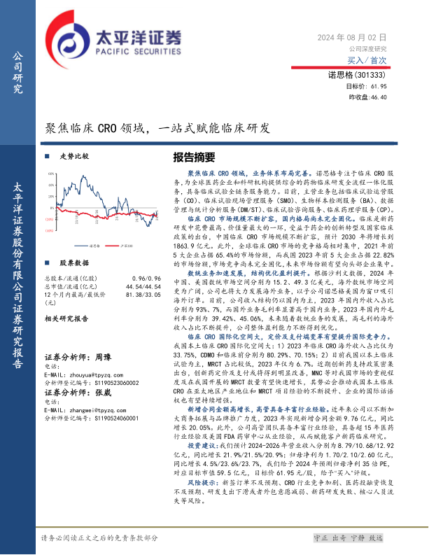 风险提示:新签订单不及预期、CRO行业竞争加剧、医药投融资恢复不及预期、研发支出下滑或者外包意愿减弱、新药研发失败、核心人员流失等风险。