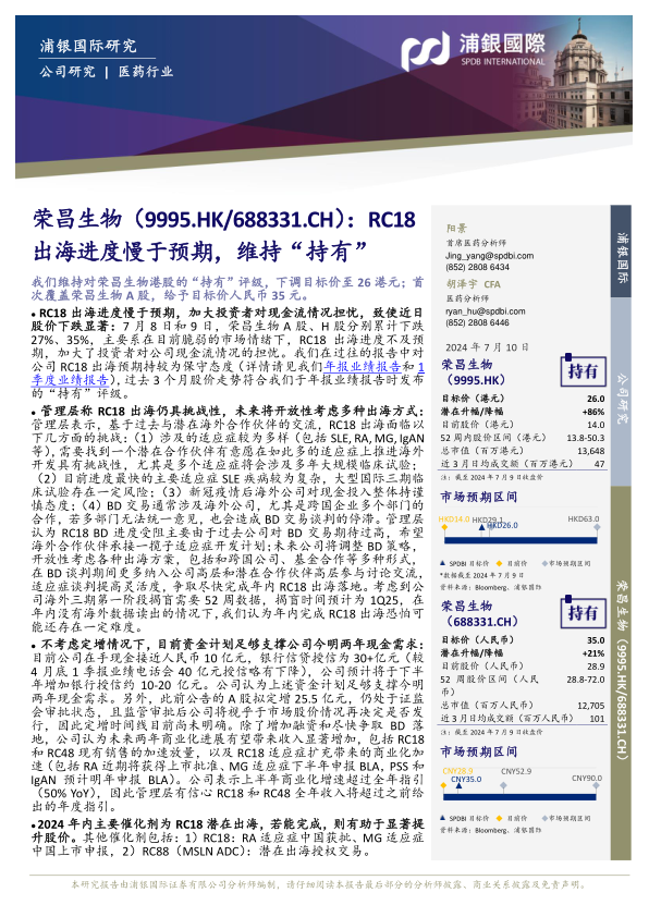 RC18出海进度慢于预期,加大投资者对现金流情况担忧,致使近日股价下跌显著:7月8日和9日,荣昌生物A股、H股分别累计下跌27%、35%,主要系在目前脆弱的市场情绪下,RC18出海进度不及预期,加大了投资者对公司现金流情况的担忧。我们在过往的报告中对公司RC18出海预期持较为保守态度(详情请见我们年报业绩报告和1季度业绩报告),过去3个月股价走势符合我们于年报业绩报告时发布的“持有”评级。