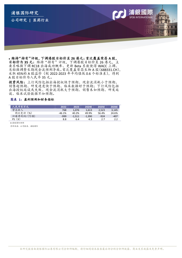 我们维持对荣昌生物港股的“持有”评级,下调目标价至26港元;首次覆盖荣昌生物A股,给予目标价人民币35元。