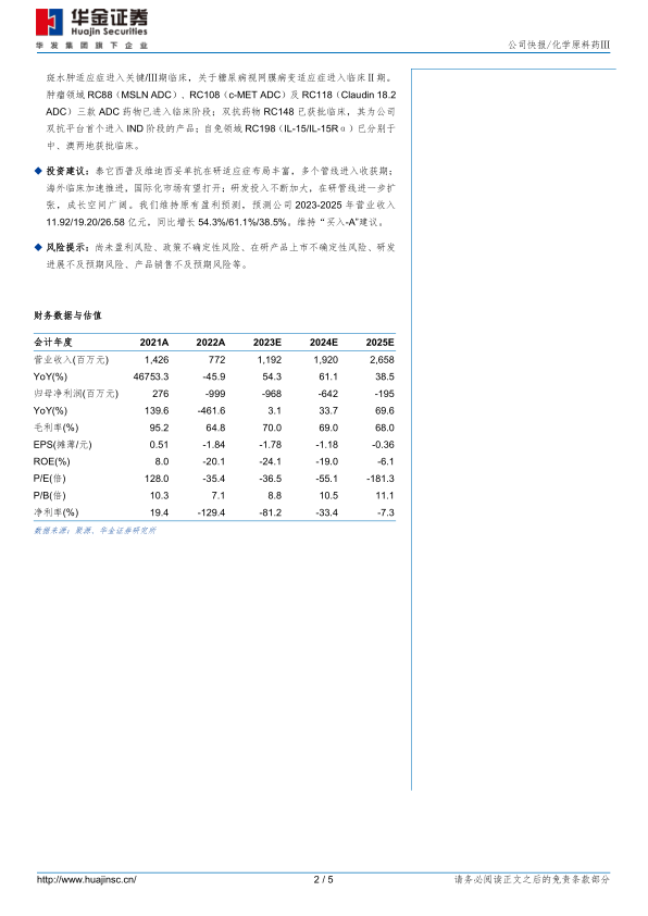 投资建议:泰它西普及维迪西妥单抗在研适应症布局丰富,多个管线进入收获期;海外临床加速推进,国际化市场有望打开;研发投入不断加大,在研管线进一步扩张,成长空间广阔。我们维持原有盈利预测,预测公司2023-2025年营业收入11.92/19.20/26.58亿元,同比增长54.3%/61.1%/38.5%。维持“买入-A”建议。