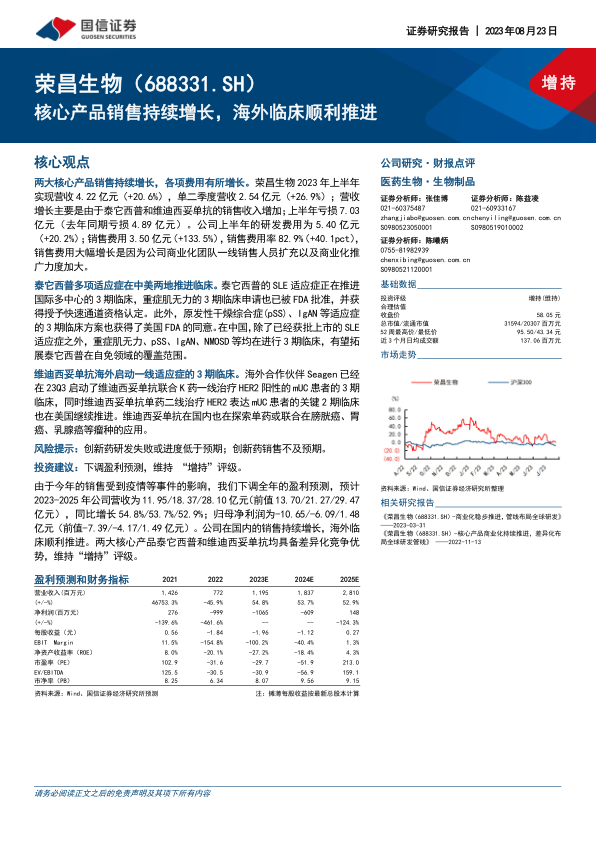 由于今年的销售受到疫情等事件的影响,下调全年的盈利预测,预计2023-2025年公司营收为11.95/18.37/28.10亿元,同比增长54.8%/53.7%/52.9%;归母净利润为-10.65/-6.09/1.48亿元。公司在国内的销售持续增长,海外临床顺利推进。两大核心产品泰它西普和维迪西妥单抗均具备差异化竞争优势,维持“增持”评级。