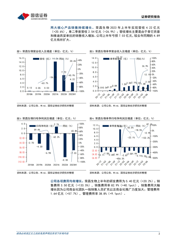 两大核心产品销售持续增长, 各项费用有所增长。 荣昌生物 2023 年上半年实现营收 4.22 亿元(+20.6%) , 单二季度营收 2.54 亿元(+26.9%) ; 营收增长主要是由于泰它西普和维迪西妥单抗的销售收入增加; 上半年亏损 7.03亿元(去年同期亏损 4.89 亿元) 。 公司上半年的研发费用为 5.40 亿元(+20.2%) ; 销售费用 3.50 亿元(+133.5%) , 销售费用率 82.9%(+40.1pct),销售费用大幅增长是因为公司商业化团队一线销售人员扩充以及商业化推广力度加大。