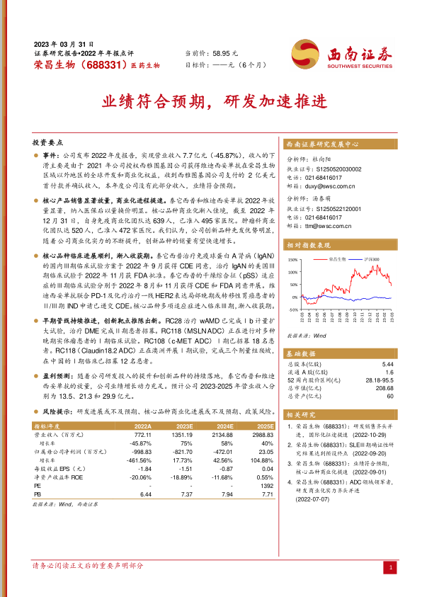 本报告分析了荣昌生物2022年年报,指出公司业绩符合预期,核心产品商业化提速,临床研发进展顺利。虽然2022年营收有所下滑,但核心产品销售放量,多项临床试验进入后期阶段,为未来业绩增长奠定基础。同时,报告也提示了相关风险,为投资者提供了参考。