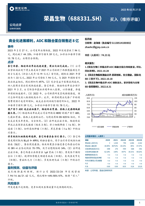 本报告分析了荣昌生物2022年的业绩快报,并对公司未来发展进行了展望。核心观点如下: