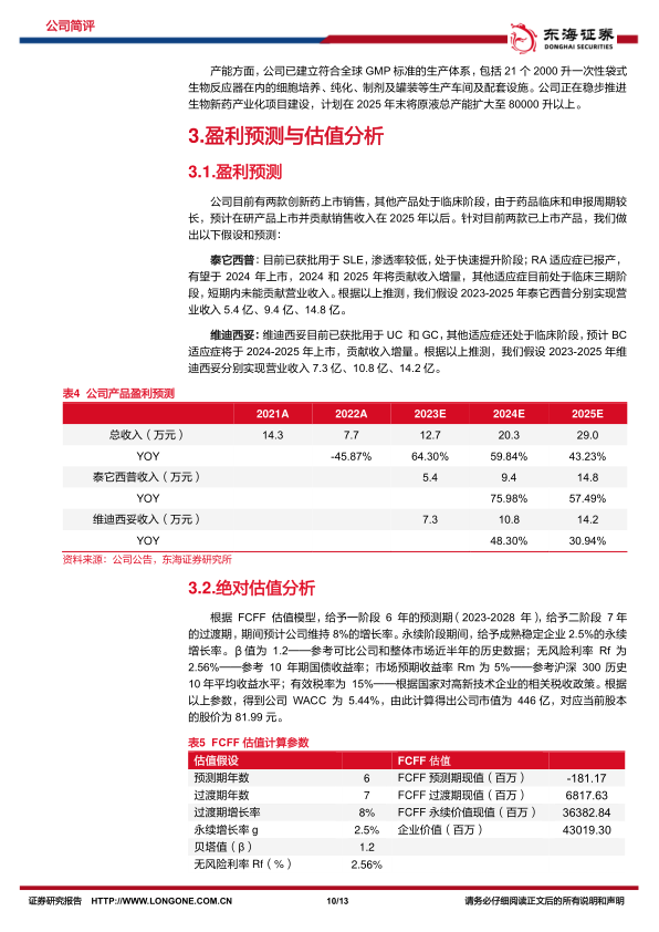 盈利预测: 基于泰它西普(SLE、RA)和维迪西妥单抗(UC、GC、BC)的销售预期,本报告预测公司2023-2025年营业收入分别为12.69亿元、20.28亿元和29.04亿元。归属于母公司净利润预计分别为-6.25亿元、-5.06亿元和-1.74亿元,显示亏损将逐年收窄。
