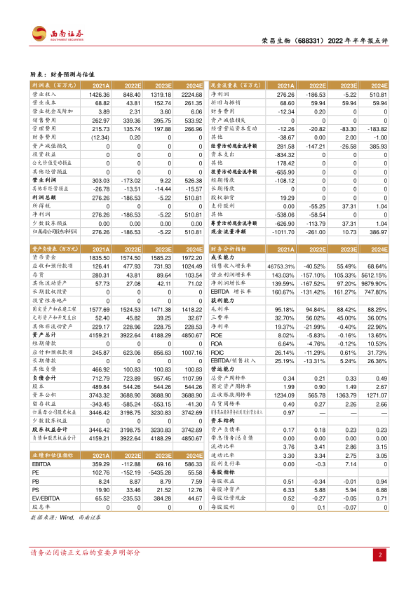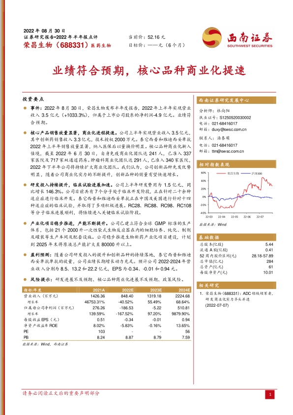 本报告分析了荣昌生物(688331)2022年半年度报告,核心观点如下: