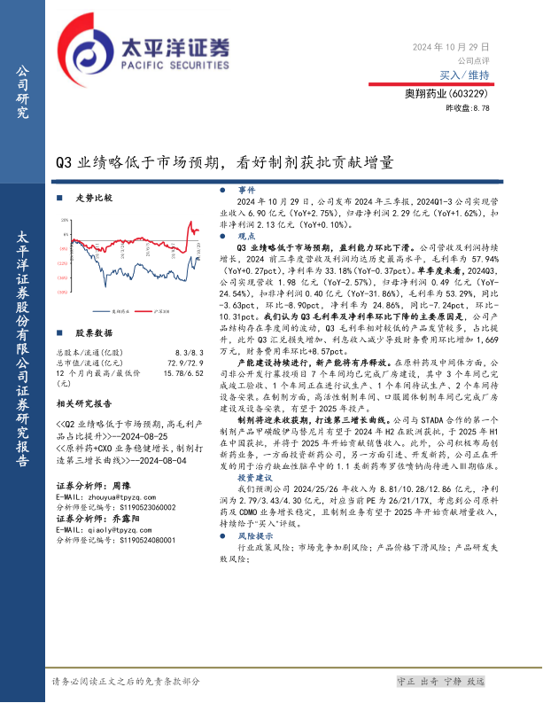 本报告对奥翔药业2024年第三季度业绩进行了分析,指出公司Q3业绩虽短期承压,但前三季度整体营收和利润均创历史新高,显示出稳健的经营基础。报告强调了公司在原料药及中间体和制剂领域的持续产能扩张,特别是制剂业务被寄予厚望,有望成为公司未来的重要增长引擎。太平洋证券基于对公司业务增长潜力的信心,维持“买入”评级,并提供了未来三年的详细财务预测,同时提示了潜在的市场和研发风险。