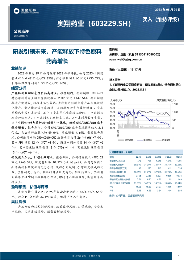 奥翔药业2023年上半年业绩表现亮眼,特色原料药业务受益于产能释放实现高速增长,CRO/CDMO/CMO业务稳步发展。公司持续加大研发投入,创新药研发有望带来新的增长点。维持“买入”评级,但需关注产品研发、政策监管、环保、安全生产、汇率波动以及限售股解禁等风险。