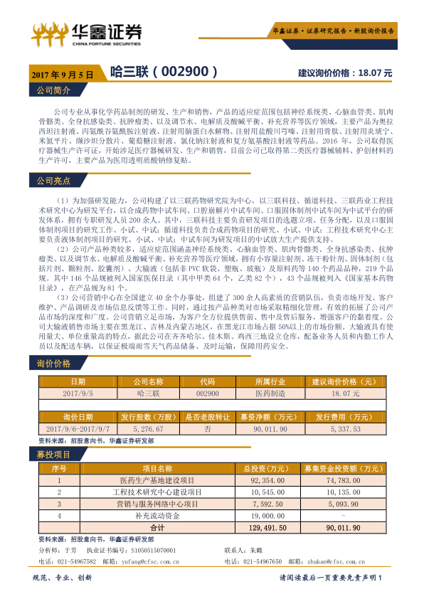本报告对哈三联(002900)进行了新股询价分析,建议询价价格为18.07元。报告详细介绍了公司的基本情况、核心竞争力以及募投项目。哈三联在研发、产品和营销方面均具备优势,有望在医药市场取得进一步发展。