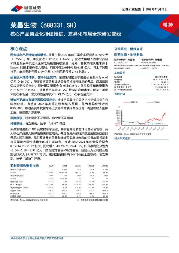 荣昌生物是国产ADC药物的领军企业,拥有差异化和全球化的研发管线。两大核心产品进入医保后销售持续增长,并且在海外的临床以及后续适应症的开发均顺利推进。我们预计泰它西普和维迪西妥单抗未来的销售放量将是支持公司营收端快速增长的核心驱动力,预计 2022-2024 年的营收分别为8.12/14.28/21.27亿元, 同比增长-43.1%/75.9%/48.9%, 归母净利润分别为-8.54/-6.30/-3.91亿元。结合绝对估值和相对估值,我们认为公司的合理股价区间为89.91~97.73元,相对当前股价有14%~24%的上涨空间;首次覆盖,给予“增持”评级。