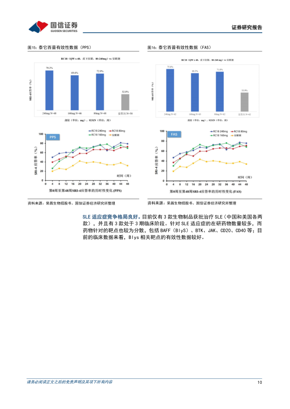 系统性红斑狼疮(SLE)是一种潜在致死的系统性自身免疫性疾病,患者多为育龄女性。2020年全球SLE患者数量达779.55万人,其中中国约103.49万人。预计中国适用泰它西普治疗的SLE患者人群将从2020年的28.03万人增至2030年的42.39万人。目前SLE治疗药物包括糖皮质激素、抗虐药、免疫抑制剂和生物制剂,生物制剂能显著增加患者缓解率并减少激素用量。目前仅有3款生物制剂获批用于中重度SLE治疗,泰它西普的临床数据显示,在48周时SRI-4应答率显著优于安慰剂组(PPS集:79.2%/69.6%/72.9% vs 32.0%,p<0.001)。