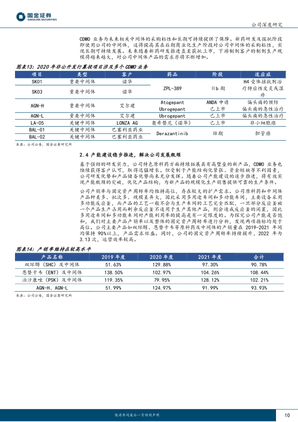 依托丰富的研发经验和良好的国际cGMP体系,公司的CRO/CDMO/CMO业务快速发展,成为近年主要增长动能。2019年至2022年,该业务收入从0.82亿元增长至4.05亿元,CAGR高达49.2%。截至2022年,公司进行中的CXO业务项目共33个,其中API项目14个,高级中间体项目19个。公司已成为诺华、LONZA、艾尔建等多家国际大型制药企业的战略供应商。为解决产能瓶颈,公司积极推进产能建设。2020年募投的“特色原料药及关键医药中间体生产基地建设项目(一期)”7个车间已完成厂房建设,预计满产后可贡献收入6.47亿元。2023年1月,公司完成了“高端制剂国际化项目与特色原料药及关键医药中间体产业化项目(二期)”的非公开发行,募集资金净额4.74亿元。两期项目达产后,预计总收入可达10.48亿元,将大幅提升公司总产值。