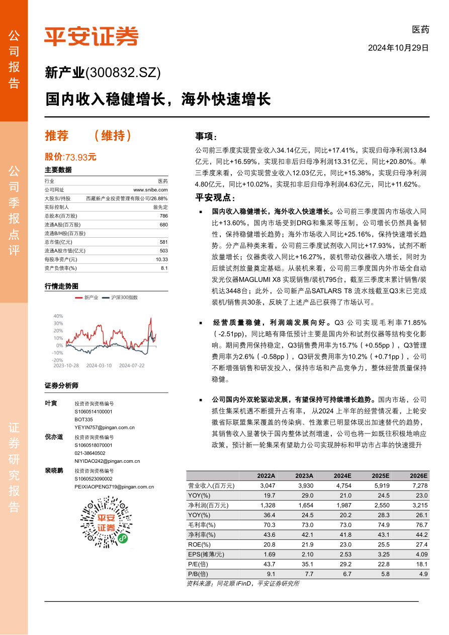 新产业在2024年前三季度展现出稳健的业绩增长,营业收入和归母净利润均实现双位数增长。公司成功实施“国内外双轮驱动”战略,国内市场在集采压力下保持韧性增长,并通过积极响应政策提升市场份额;海外市场则通过精细化管理和本地化运营实现快速扩张,盈利能力持续增强。公司通过持续的仪器装机和试剂放量,巩固了市场地位。尽管毛利率受结构性变化影响略有波动,但公司通过加大销售和研发投入,保持了核心竞争力,经营质量保持稳健。平安证券维持“推荐”评级,并调整了未来三年的盈利预测,认为公司凭借强劲的装机量和中大型机占比提升,有望持续带动试剂放量,实现可持续增长。同时,报告也提示了产品销售、装机推广及政策影响等潜在风险。