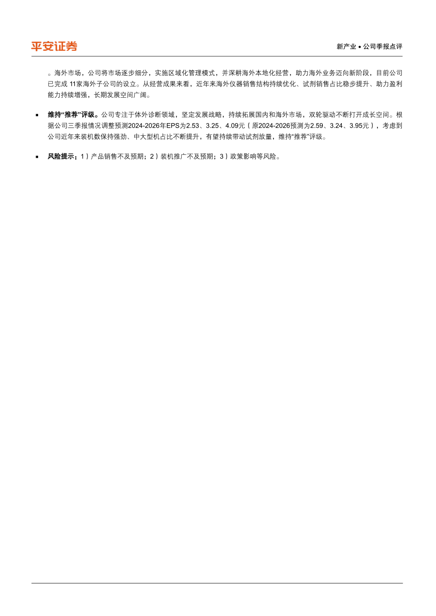 维持“推荐”评级。公司专注于体外诊断领域,坚定发展战略,持续拓展国内和海外市场,双轮驱动不断打开成长空间。根据公司三季报情况调整预测2024-2026年EPS为2.53、3.25、4.09元(原2024-2026预测为2.59、3.24、3.95元),考虑到公司近年来装机数保持强劲、中大型机占比不断提升,有望持续带动试剂放量,维持“推荐”评级。