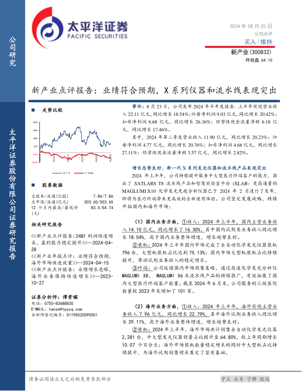 新产业公司在2024年上半年实现了营收和净利润的稳健增长,业绩符合市场预期。这主要得益于公司持续的产品创新,特别是新一代X系列化学发光免疫分析仪器和SATLARS T8流水线产品的成功推出和市场推广,这些产品显著提升了公司在中大型医疗终端客户的服务能力。