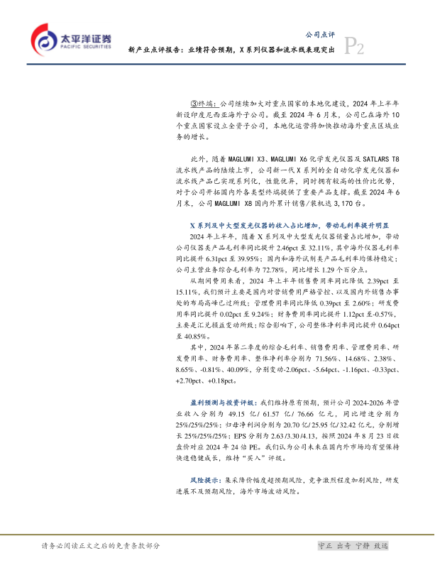 新产业公司2024年上半年业绩表现出色,营收和净利润均实现两位数增长,符合市场预期。公司通过持续的产品创新,特别是X系列仪器和流水线产品的成功推广,有效提升了市场竞争力。国内外市场拓展策略卓有成效,国内大型机装机占比和三级医院客户数量显著增加,海外业务通过本地化建设和中大型机销量提升实现快速放量。产品结构优化带动毛利率和净利率的提升,显示出公司强大的盈利能力和精细化管理水平。展望未来,公司有望在国内外市场保持快速稳健增长,维持“买入”评级,但需关注集采、市场竞争、研发及海外市场波动等潜在风险。