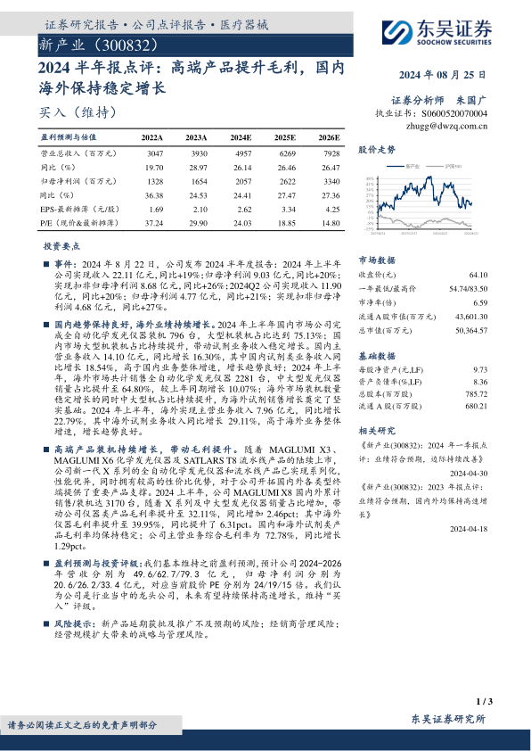 新产业在2024年上半年实现了稳健的业绩增长,营业收入和归母净利润均同比增长约20%。公司国内外市场均保持良好发展势头,特别是海外市场和试剂业务增速显著。高端X系列化学发光仪器及流水线产品的持续推广,有效优化了产品结构,带动公司综合毛利率提升1.29个百分点至72.78%。分析师维持了对公司未来三年营收和净利润的乐观预测,并重申“买入”评级,肯定了公司作为行业龙头的增长潜力,但同时提示了新产品推广、经销商管理和规模扩张等潜在风险。