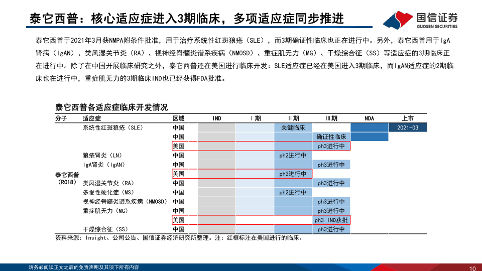 泰它西普于2021年3月获NMPA附条件批准用于治疗SLE,目前3期确证性临床正在进行中。除了SLE,泰它西普在IgA肾病(IgAN)、类风湿关节炎(RA)、视神经脊髓炎谱系疾病(NMOSD)、重症肌无力(MG)、干燥综合征(SS)等多种适应症的3期临床也在中国同步推进。在全球化布局方面,泰它西普的SLE适应症已在美国进入3期临床,IgAN适应症在美国进行2期临床,MG的3期临床IND也已获FDA批准。