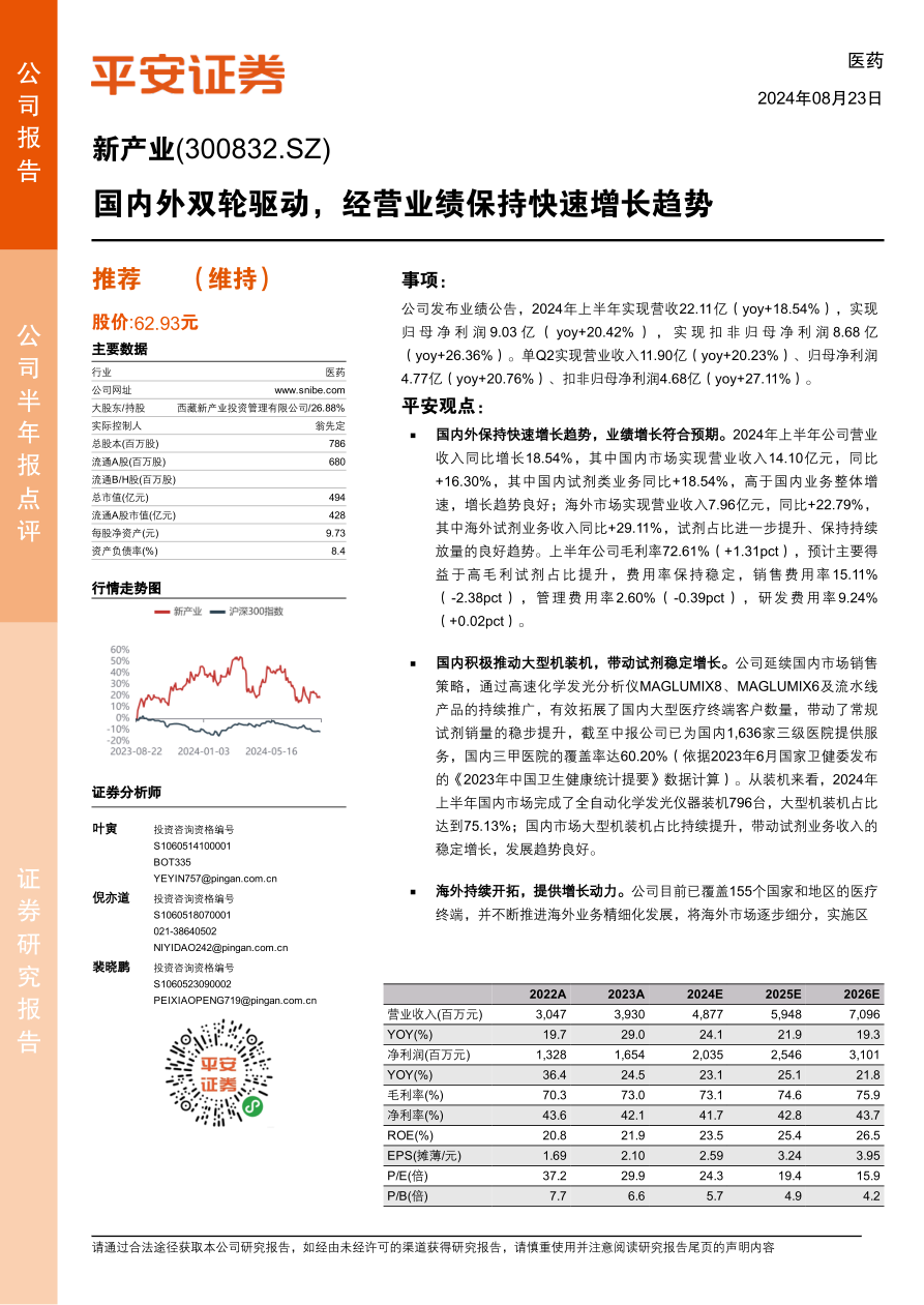 新产业公司2024年上半年业绩表现出色,国内外市场均实现快速增长,盈利能力稳步提升。通过不断拓展市场、优化产品结构和加强本地化运营,公司在体外诊断领域具备较强的竞争力。