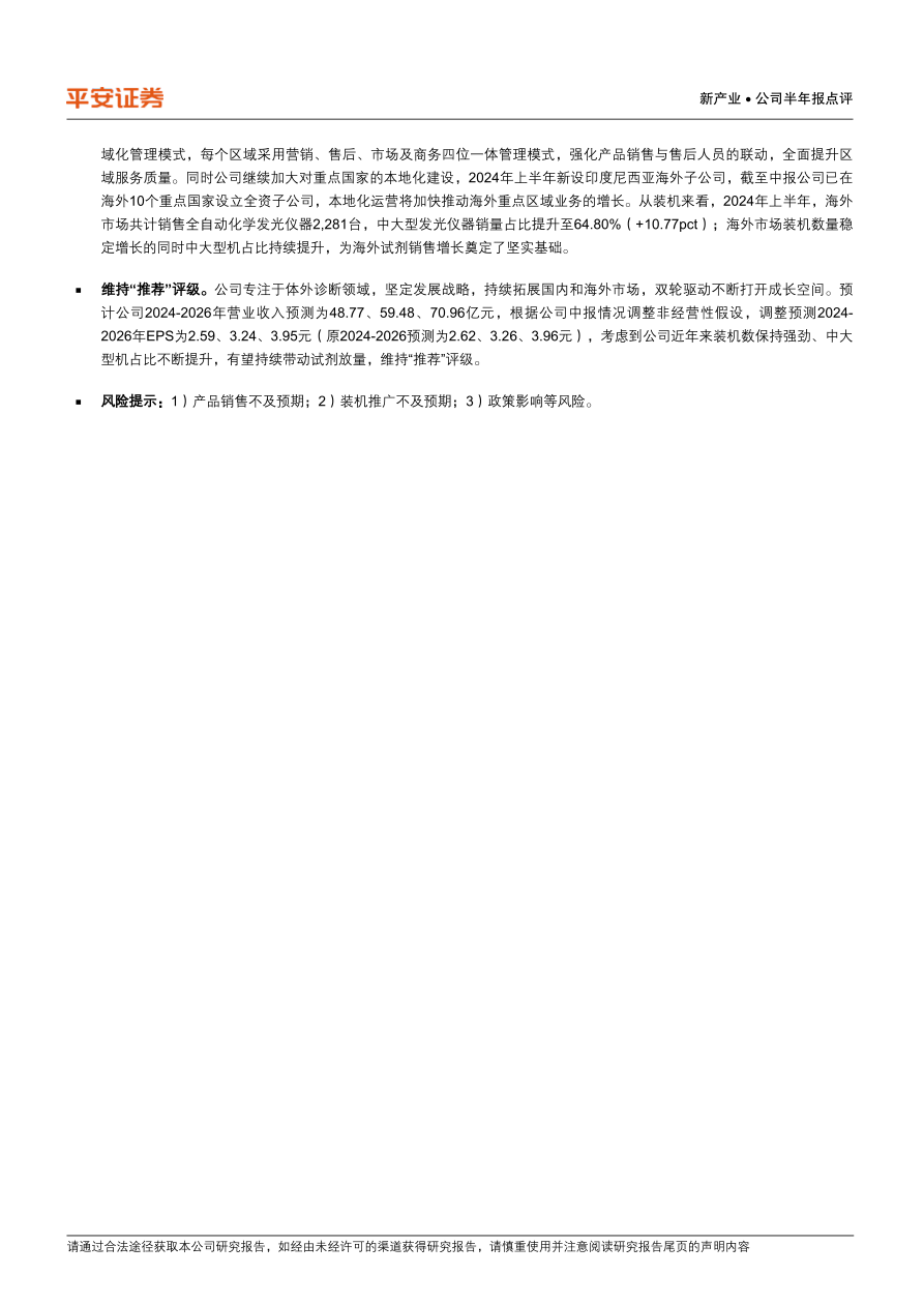 维持“推荐”评级。公司专注于体外诊断领域,坚定发展战略,持续拓展国内和海外市场,双轮驱动不断打开成长空间。预计公司2024-2026年营业收入预测为48.77、59.48、70.96亿元,根据公司中报情况调整非经营性假设,调整预测2024-2026年EPS为2.59、3.24、3.95元(原2024-2026预测为2.62、3.26、3.96元),考虑到公司近年来装机数保持强劲、中大型机占比不断提升,有望持续带动试剂放量,维持“推荐”评级。