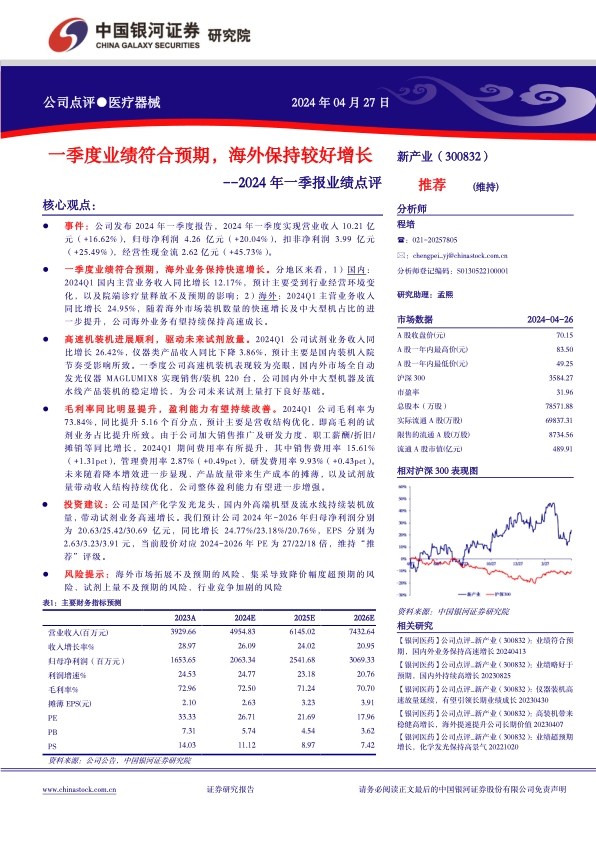 本报告对新产业2024年一季度业绩进行了全面分析,公司一季度业绩符合预期,海外业务保持快速增长,高速机装机进展顺利,驱动未来试剂放量,毛利率同比明显提升,盈利能力有望持续改善。维持“推荐”评级,但同时也提示了海外市场拓展、集采降价、试剂上量和行业竞争等风险。