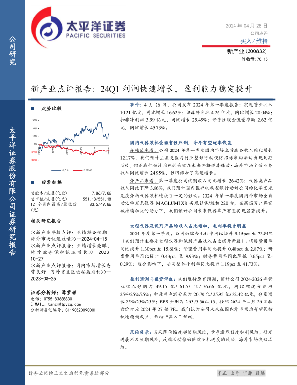 新产业点评报告:24Q1利润快速增长,盈利能力稳定提升
