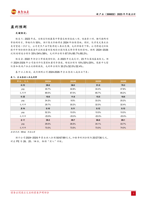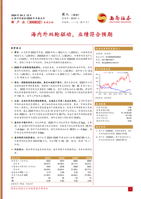 本报告对新产业2023年年报进行了全面分析,公司在海内外市场均实现了高速增长,盈利能力稳步提升。国内市场受益于集采带来的国产替代机遇,海外市场则通过本地化布局实现了快速扩张。预计未来三年公司业绩将保持快速增长,维持“买入”评级。但投资者仍需关注集采降价、海外销售不及预期以及市场竞争加剧等风险因素。