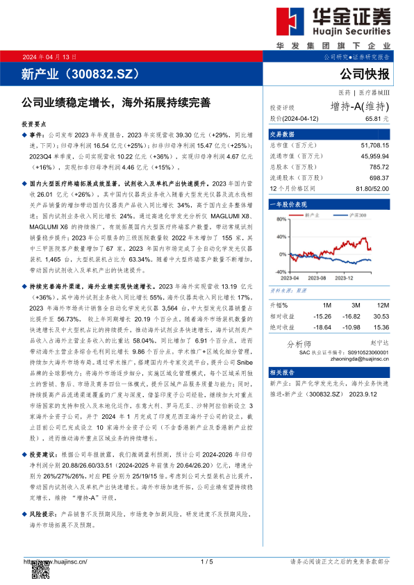基于公司年报披露的良好业绩和未来发展趋势,华金证券微调了盈利预测。预计公司2024-2026年归母净利润分别为20.88亿元、26.60亿元和33.51亿元(2024-2025年前值为20.64亿元/26.20亿元),增速分别为26%、27%和26%。对应预测市盈率(PE)分别为25倍、19倍和15倍。考虑到公司大型装机占比提升带动国内试剂收入及单机产出快速增长,以及海外市场加速开拓,公司业绩有望持续稳定增长。因此,华金证券维持对新产业的“增持-A”投资评级。