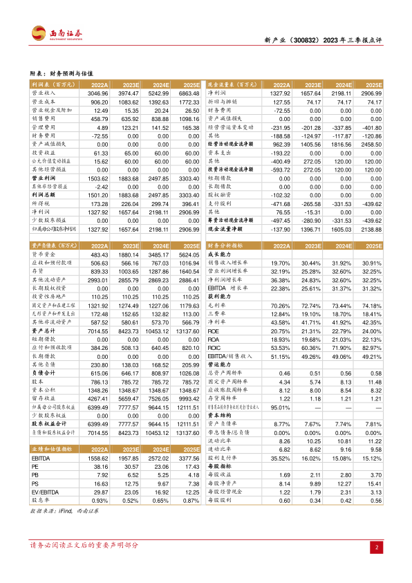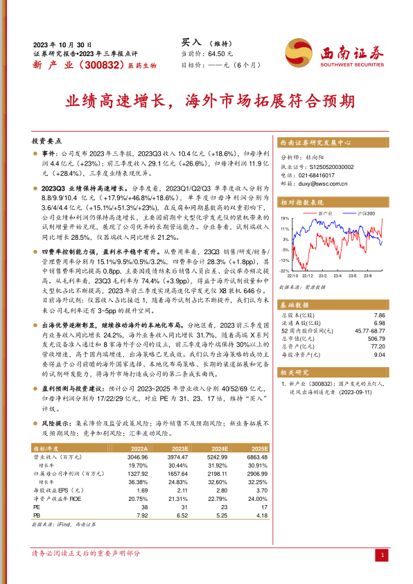 本报告对新产业2023年三季报进行了详细分析,公司业绩保持高速增长,盈利能力稳中有升,海外市场拓展策略成效显著。维持“买入”评级,但同时也提示了集采降价、海外销售、新业务拓展、竞争加剧以及汇率波动等风险。